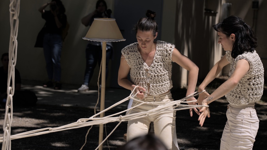 Melic, the knitted rope is the main character of this project and it is also what gives the name to the piece. Melic is on stage next to their authors, Shalom and Mar, whose bodies compose a symbiosis talking from their shapes and textures. A dialogue between hand-knitted ropes that transform, tighten and loosen, knit and unknit, rock and carry.