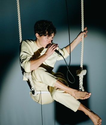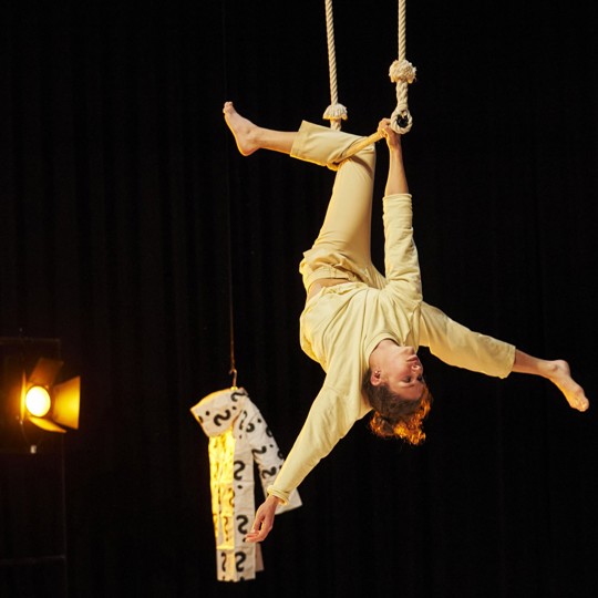 The piece takes place between a woman on the trapeze, her alter ego in the form of a loudspeaker and the audience and their own questions. A rap battle, various movement languages on the trapeze, helium balloons and a set filled with question marks result in a multi-layered performance with trapeze, language and stage design.