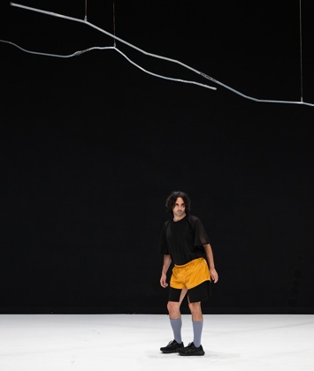 Scenes include a dance for re-invented heritage, an ode to staying with your pain, and the creation and dissolution of rhythmical creatures that carry energies of power, fragility, inevitability and absurdity. The stories of Hermes and Icarus merge in a transitory scene that grapples to deliver a message, while the myth of Sisyphus is used notas a mechanical force to continue but as a necessary suspension to the relentless reformulation and ambition ofthe protagonist to arrive within his body.