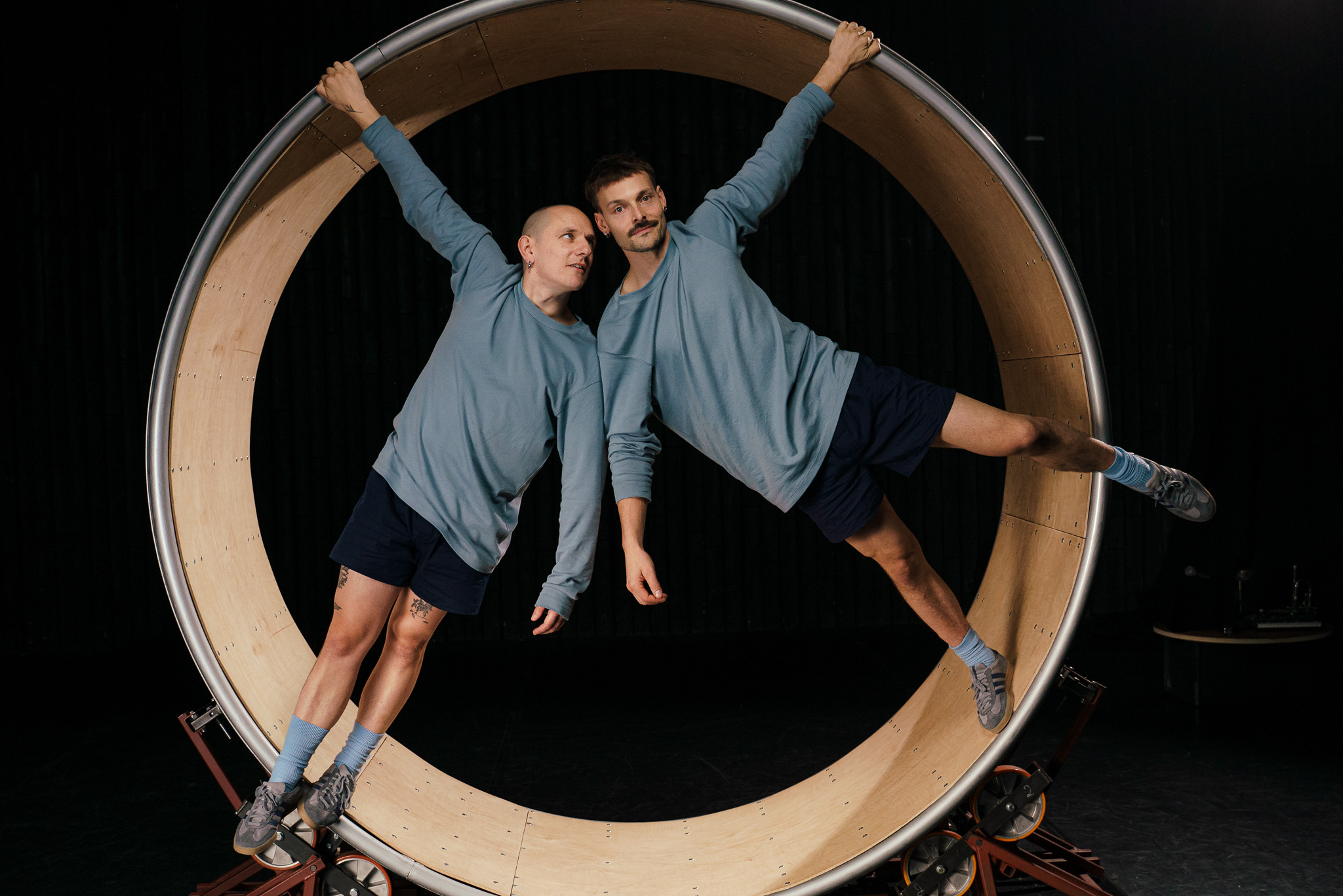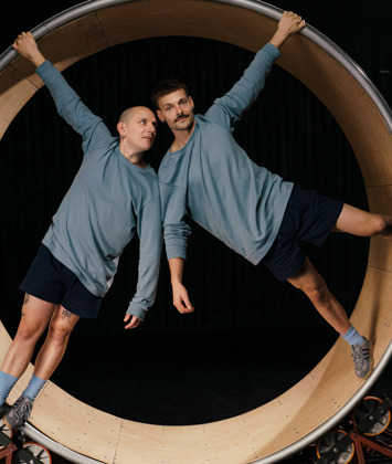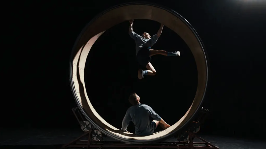 Welcome to The Idle Hour, a striking reflection on our relentless drive for productivity. The madness of our times—the race towards elusive happiness—comes alive in this performance by Samuel Rhyner and William Blenkin. With acrobatics, dance, and pulsating sound, a wordless journey unfolds in search of stillness within the chaos. How can we, as humans, pause long enough to stop the wheel from turning?