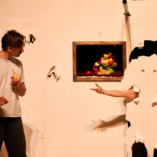 Wat begint als een simpele eetscène, groeit uit tot een bezeten, bijna machinaal ritueel. Langzaam vervagen de grenzen tussen verlangen en noodzaak, tot er iets grotesks, verrassends en verontrustend hypnotiserends ontstaat. Met acrobatiek en objectmanipulatie bouwen deze gevatte circusmakers product voor product aan een confronterende lichaamstaal. Een taal die niet alleen hun eigen, maar misschien ook jóuw ideeën over consumptiegewoonten op z’n kop zet. Gewoonten die gevormd zijn onder de stille druk van commerciële overtuigingskrachten.