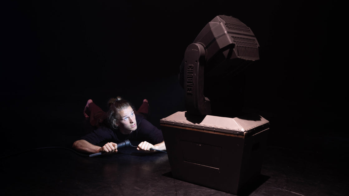 Raff gooit, rolt en vangt zowel zichzelf als zijn jongleerballen in deze voorstelling in een schitterend lichtschouwspel vol humor en verrassing. Maar! Ook de lamp imponeert, met zijn oneindige opties en bewegingen, vloeiend als een elegante danser. Langzaam eist die theaterlamp z’n plek in de spotlight op. En zo zien we iets wat eerst een vriendelijk duet was, transformeren in een iets minder vriendelijk duel. Kom dit wonderlijke spel van (ver)schijnen en verdwijnen ervaren. En zie hoe de grenzen tussen mens en machine bevraagt en verschoven worden.
