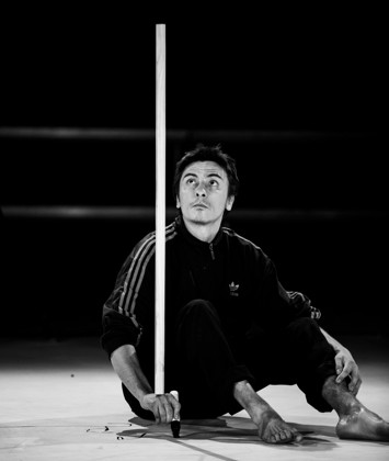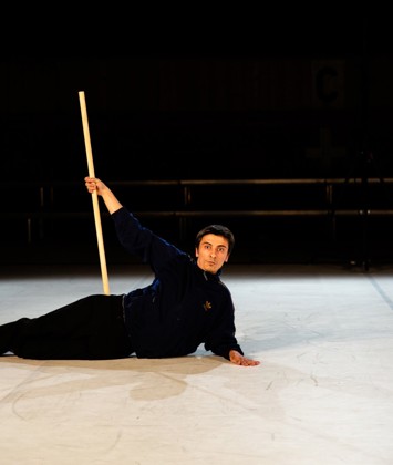 De man balanceert de stok op verschillende, vaak onhandige, delen van zijn lichaam, terwijl de televisie op de achtergrond elk moment op wrange wijze benoemt.