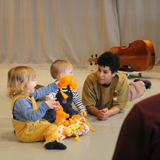Een danser, een circusartiest en een cellist op de vloer! Ze gaan op onderzoek uit in een ruimte vol lijnen en wielen, en een knappe muzikant op de cello maakt mooie muziek. Als publiek komen we zelf langzaam maar zeker steeds meer op de speelvloer terecht. Peuters en ouders storten zich op rollen toneeltape, maken lijnen en peuteren ze los. Rol voorbij op een karretje, jij doet mee met dit circus!