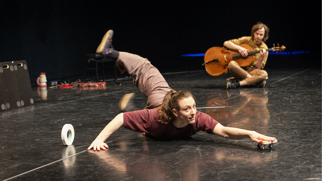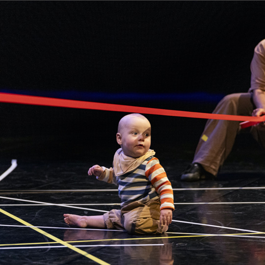Een danser, een circusartiest en een cellist op de vloer! Ze gaan op onderzoek uit in een ruimte vol lijnen en wielen, en een knappe muzikant op de cello maakt mooie muziek. Als publiek komen we zelf langzaam maar zeker steeds meer op de speelvloer terecht. Peuters en ouders storten zich op rollen toneeltape, maken lijnen en peuteren ze los. Rol voorbij op een karretje, jij doet mee met dit circus!