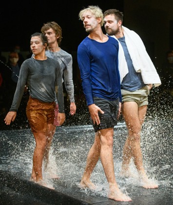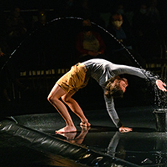 Een viertal acrobaten voeren hoogstaande kunsten uit terwijl het podium zich langzaam vult met water...