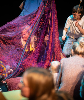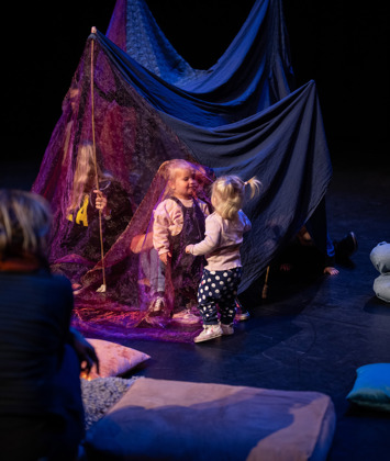 Twee spelers bouwen samen met jou een tent. Help je mee de doeken te vinden, de ritsen aan elkaar te maken en samen de stokken omhoog te houden? Langzaam ontstaat er een nieuwe wereld onder de doeken. Hoor je het ritselen van de bladeren, de druppels van de regen? Zie je de kleuren die door het doek schemeren, de schaduwen van de bomen? Samen met je ouder of alleen mag je deze wereld ontdekken. Durf jij een stap richting het onbekende te zetten?