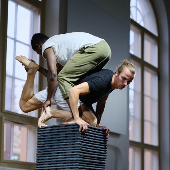 A small gesture is an expressive work that explores the limits of working and being together, on one square meter. Two men make repetitive attempts to make optimal use of the space at their disposal. Precisely the space they arrange for themselves makes their encounters ever closer and more intimate, until they end on a stack of tiles, just big enough to stand on together. A physical exploration within a very restricted and at the same time life-encompassing framework.