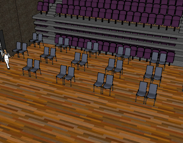 Hoe zouden de Zaal en Studio er in een anderhalvemeteropstelling uitzien? Korzo's techniekafdeling maakte een aantal schetsen.
