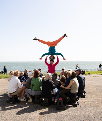 Kom en neem plaats op een van de rollende krukjes en word speler in deze beweeglijke compositie. 360, geregisseerd door Benjamin Kuitenbrouwer en Hanneke Meijers, doet een reeks speelse voorstellen. Deze voorstelling speelt zich af met en rondom het publiek. Met onverwachte wendingen en nieuwe regie-aanwijzingen verandert de groepsdynamiek en daarmee het script. Terwijl de acrobaten hun bewegingskunsten met bravoure delen, oefen jij invloed uit op de nabijheid, en op het verloop van het spel. De voorstelling nodigt uit om contact te maken, om aan te raken, om er deel van uit te maken en om te beïnvloeden. Of niets van dit alles, je kunt ook discreet opgaan in de groep. 360 wil vooral een ongedwongen samenzijn regisseren.