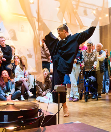 Stap tijdens het CaDance Festival onze foyer binnen en ervaar Flow Unseen, een gratis, interactieve installatie. Een 4 meter lange staf, opgehangen aan het plafond met vloeiend textiel, reageert op elke beweging met golven en draaiingen. Vanuit het principe van Wu-wei-handelen, in harmonie in plaats van controle, nodigt deze levende structuur je uit om zijn beweging te ontdekken. Of je nu kijkt of meedoet, het stuk komt tot leven door jouw aanwezigheid.
