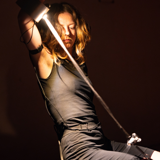 A fine line between is een audiovisuele choreografie waarin het draagbare instrument dat Britt ontwikkelde het lichaam verlengt. Door fysieke fenomenen zoals veer-galm en snaartrillingen ontstaan voortdurend veranderende klankstructuren. In plaats van het instrument simpelweg te bespelen, vormt Britt er een symbiotische relatie mee: zij reageert op de onvoorspelbare geluiden die het voortbrengt. Voor Britt is spelen een manier om balans te vinden tussen over- en onderprikkeling, iets wat voor haar moeilijk te grijpen is. Het is een zoektocht naar toevallige klanken en kleine details, die de aandacht naar het nu brengen. Britt treedt op samen met Wajda Tamer, die licht en geluid aanstuurt.